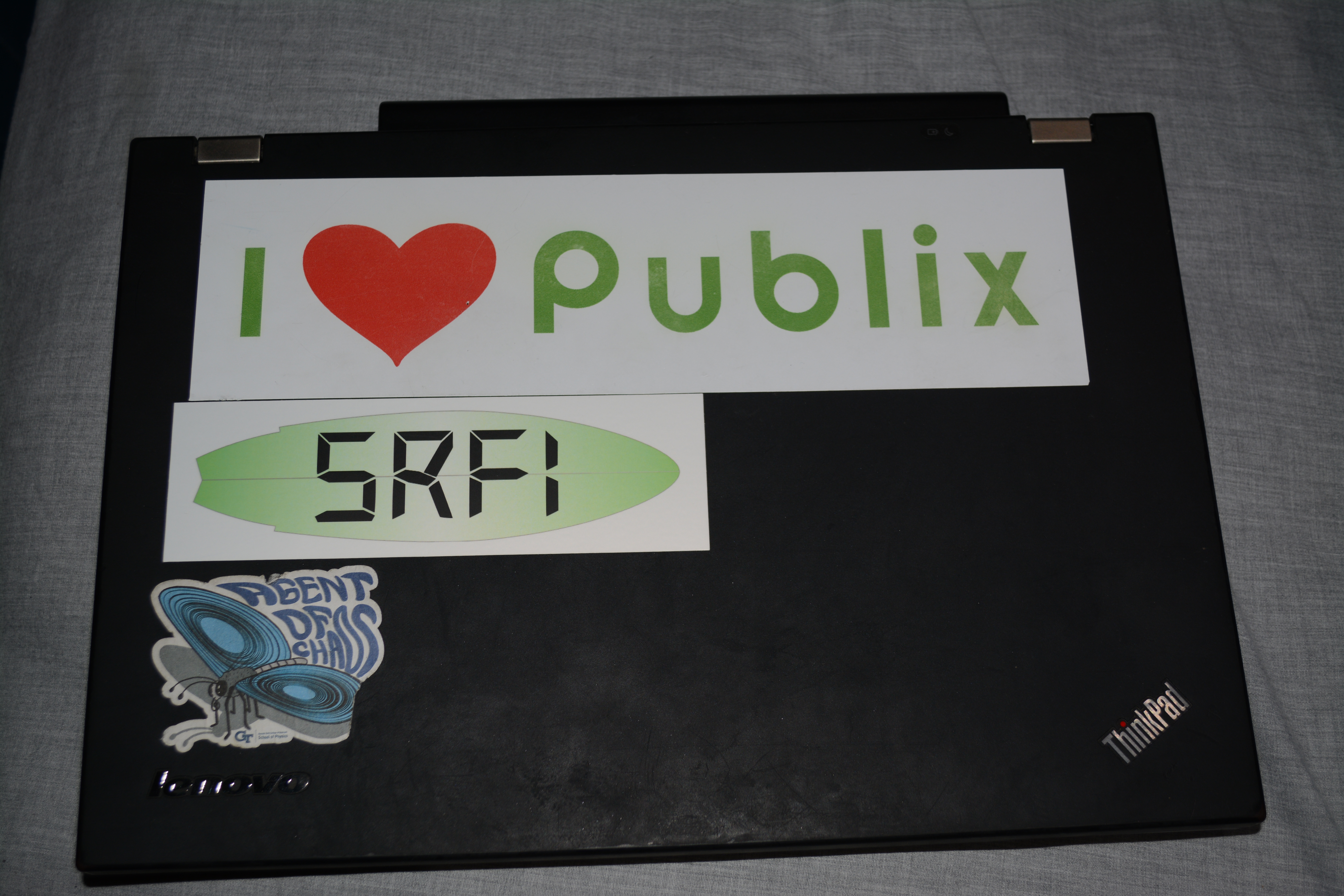 This website is written in Treeside, a document markup format that I will document on this website later. In the meantime, you can appreciate my laptop, with an authentic SRFI sticker (from the SRFI editor, Arthur Glecker) and an authentic “I Love Publix” sticker (from a Publix).